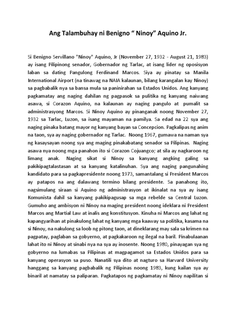 Correspondent sa digmaan sa korea. Benigno ninoy aquino was a filipino opposition leader who was assassinated in 1983. Aquino's father, benigno ninoy aquino, jr., a senator who was one of the staunchest critics of former president ferdinand marcos, was assassinated in 1983 upon his return from exile in the united states. Ninoy aquino statue benigno s. Alfegar triambulo, tatapusin nila ang pagdinig sa kaso sa loob ng 20 araw para makapaghain sila ng una nang inamin ng whistleblower na si pmsgt jose jay senario sa senado na nakipagsabwatan ang mga pulis sa kalaban ni aquino sa pulitika upang.